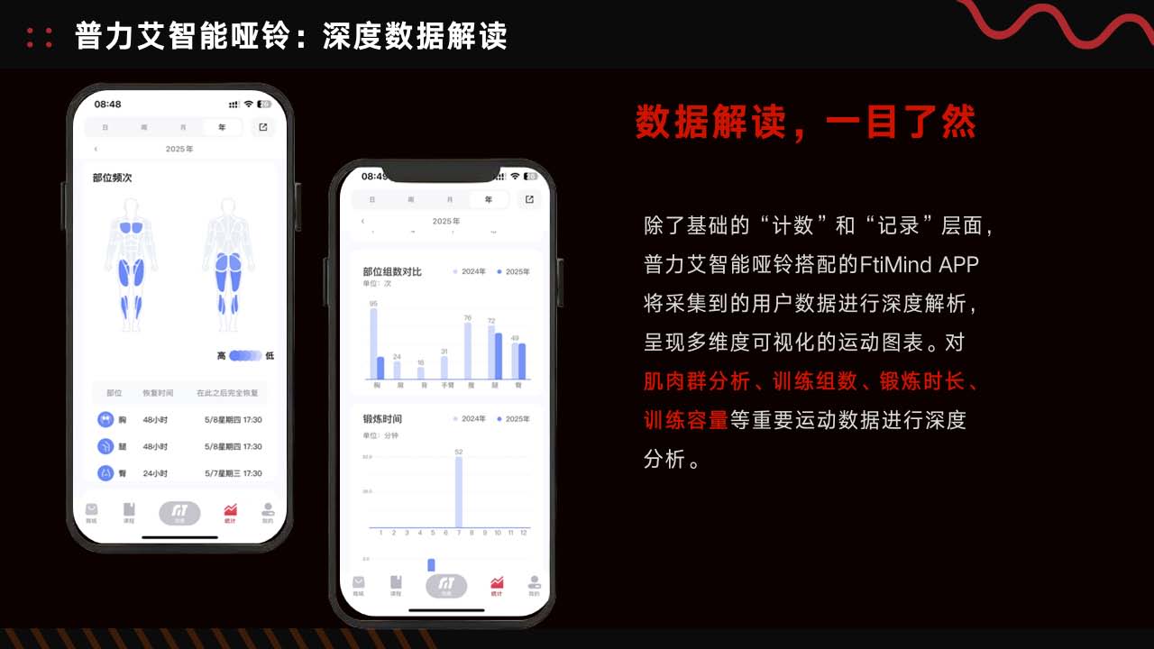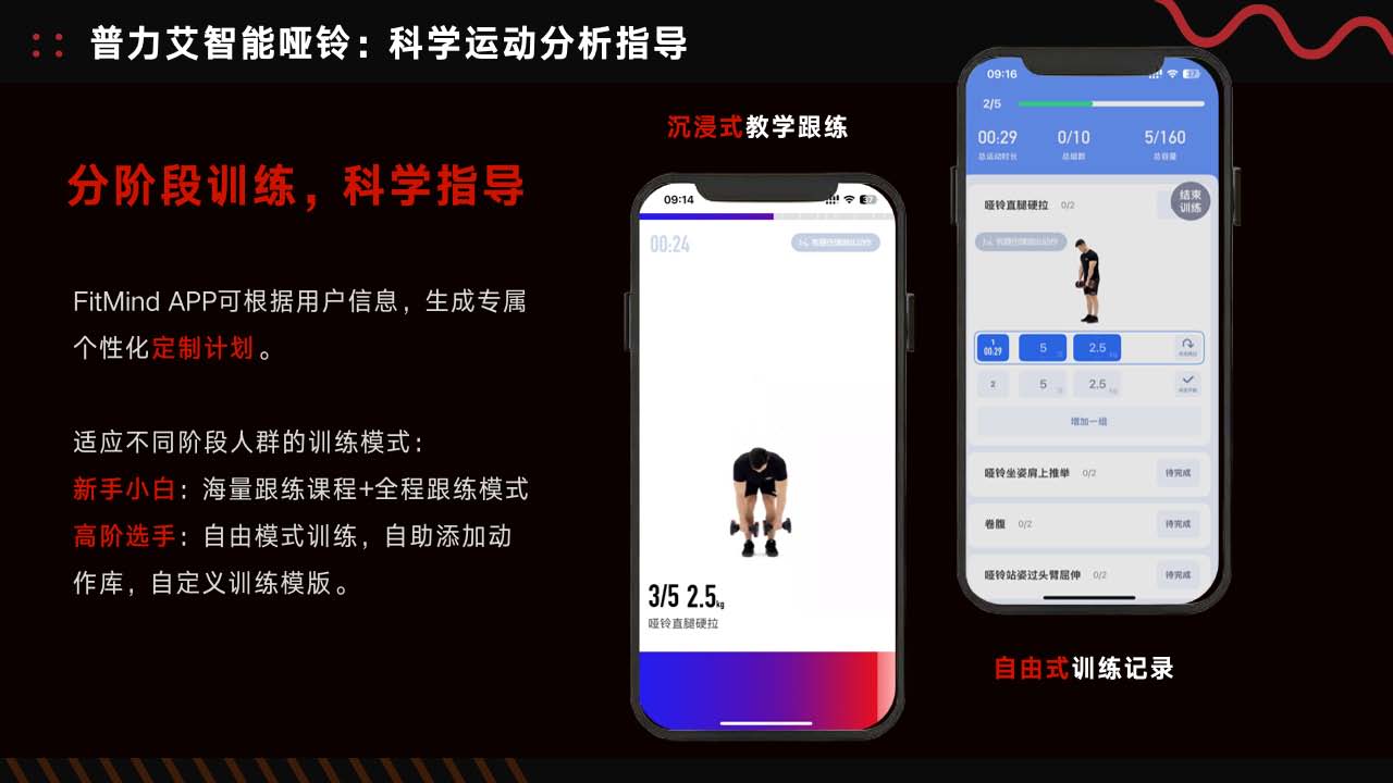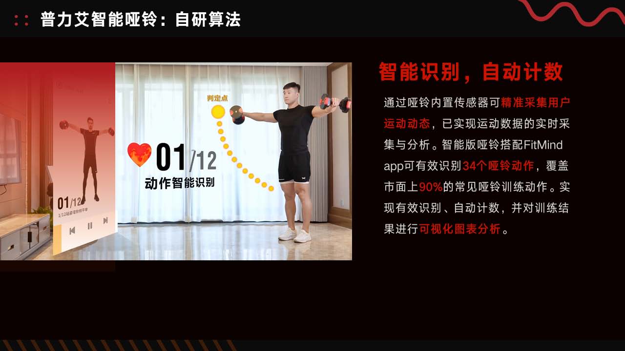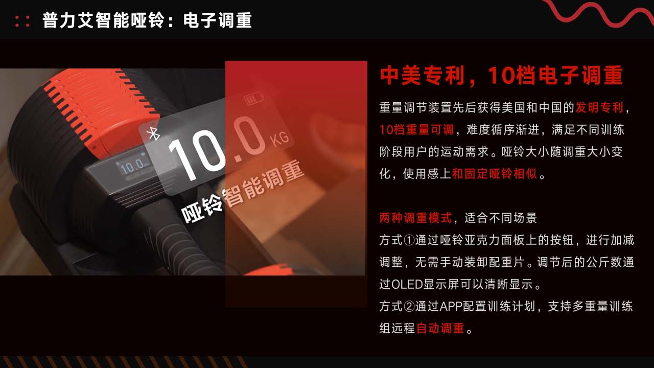 一款通过电子技术快速调节重量的智能健身器械。用户可通过哑铃控制面板上的按钮或手机APP在几秒内切换重量。智能版搭配自研算法可实现对34个哑铃动作的智能识别,自动计数。